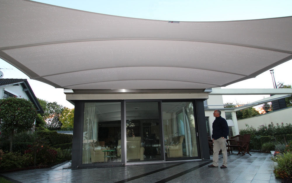 Electrically furling shade sail with external weights.